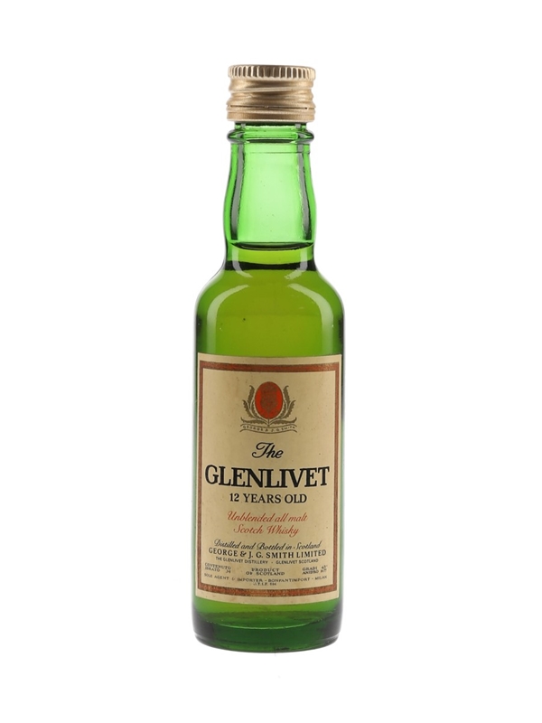 A miniature bottle of The Glenlivet 12 Year Old Unblended All Malt Scotch Whisky, distilled in Scotland by George & J G Smith. This was bottled for the Italian market and imported by Bonfantimport, we estimate in the 1970s.