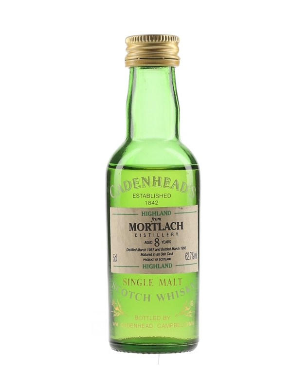 A miniature bottle of Mortlach 8 Year Old Single Malt Scotch Whisky. This was distilled in March 1987, matured in an oak cask and bottled at a cask strength of 62.7% ABV in March 1995 by Cadenhead's.
