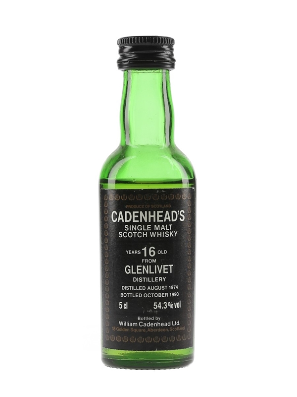A miniature bottle of Glenlivet 16 Year Old Single Malt Scotch Whisky. This was distilled in August 1974, matured in oak casks and bottled at a cask strength of 54.3% ABV in October 1990 by Cadenhead's.