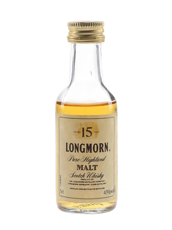 A miniature bottle of Longmorn 15 Year Old Pure Highland Malt Scotch Whisky. We estimate this was bottled in the 1980s.