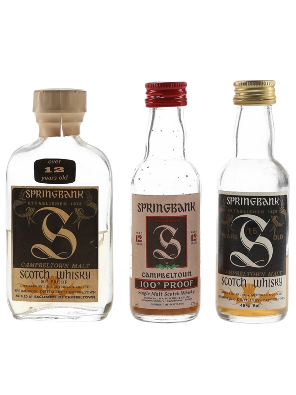 This lot contains three miniature bottles of Springbank Campeltown Malt Scotch Whisky, including 12 Year Old, 12 Year Old Cask Strength, and 15 Year Old.