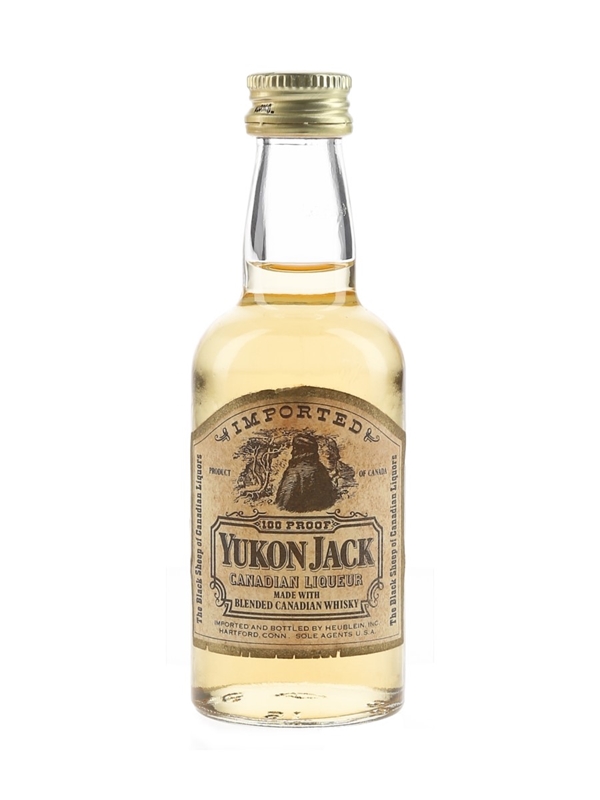 A miniature bottle of Yukon Jack Canadian Liqueur made with Blended Canadian Whisky.