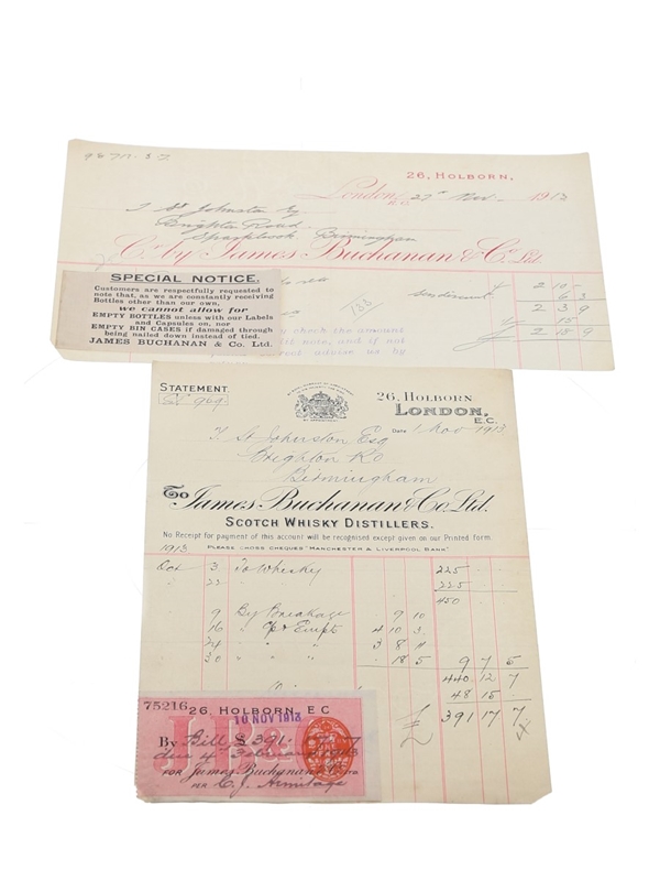 James Buchanan & Co. Ltd. Distillery Invoices & A Purchase Receipt, Dated 1913 St Johnston Esq