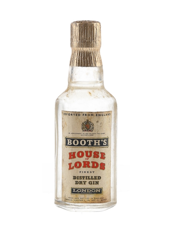 A miniature bottle of Booth's House of Lords Finest Distilled Dry Gin. We estimate this was bottled in the 1950s to 1960s.