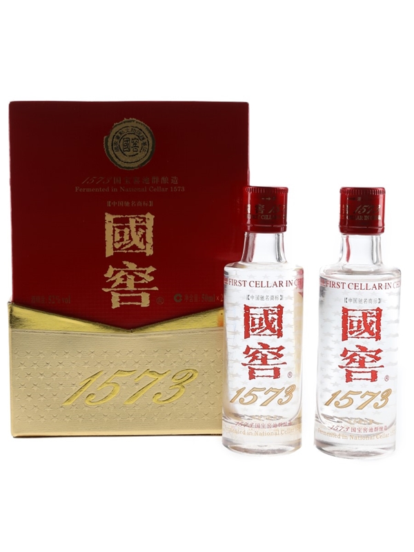 Two miniature bottles of Luzhou Laojiao 1573 Baijiu. Luzhou Laojiao is a clear spirit with a sharp aroma of fermented peaches. It is fermented in National Cellar 1573, whose walls are coated with a unique clay composition that gives the spirit its aroma and flavour.
