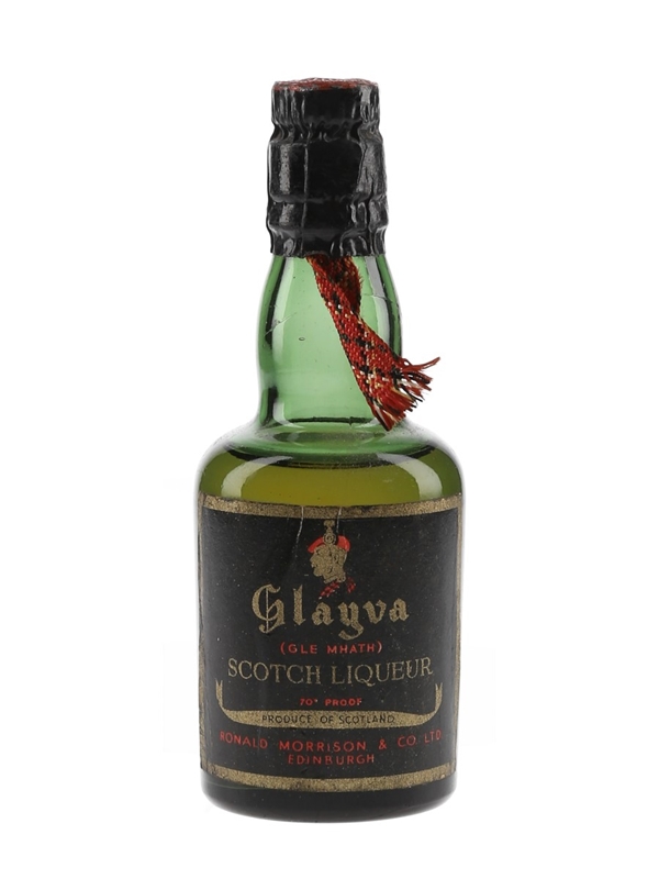 A miniature bottle of Glayva Scotch whisky liqueur, produced by Ronald Morrison & Co. Ltd. We estimate this was bottled in the 1950s to 1960s.
