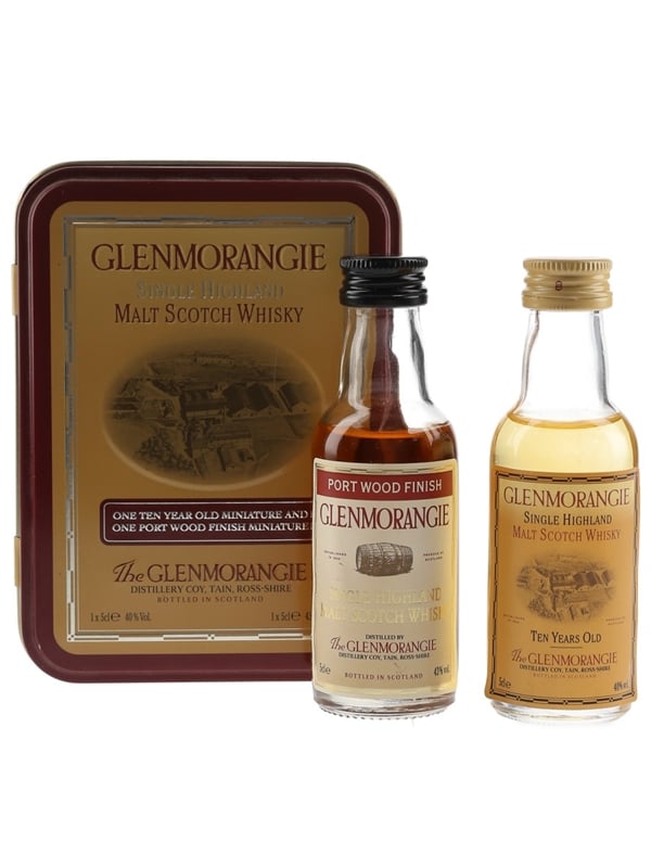 A set of two miniature bottles of Glenmorangie Single Malt Scotch Whisky presented in the original tin box, including Glenmorangie Port Wood Finish and Glenmorangie 10 Year Old.