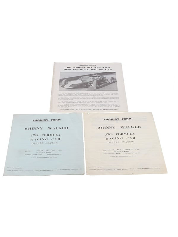 This lot contains two enquiry forms and an introduction pamphlet to the Johnny Walker JW4 New Formula Racing Car.