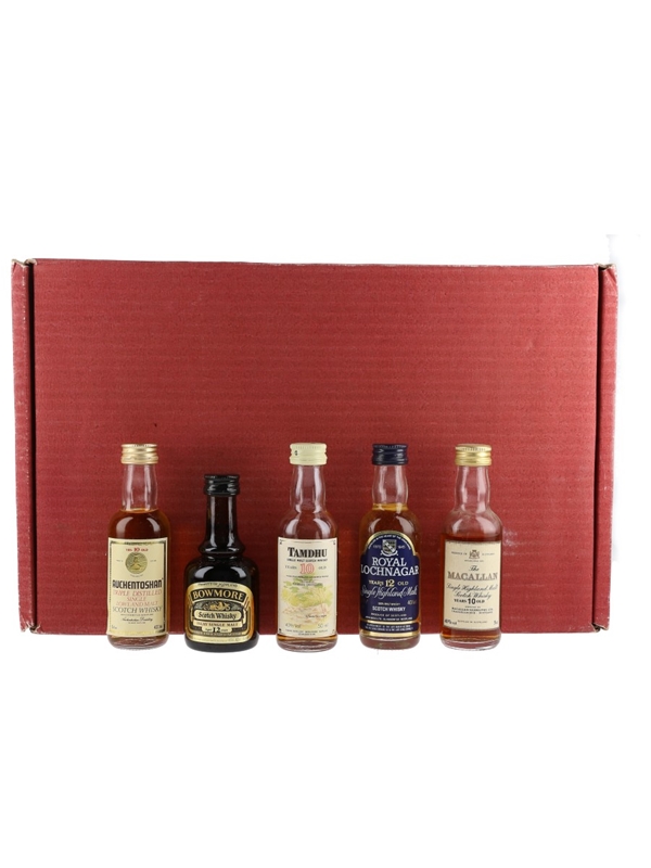 The Taste of Scotland set includes five single malt whiskies selected by Wallace Milroy to present regional characteristics, including Auchentoshan 10 Year Old, Bowmore 12 Year Old, Tamdhu 10 Year Old, Royal Lochnagar 12 Year Old, and The Macallan 10 Year Old. We estimate this was produced in the 1980s.