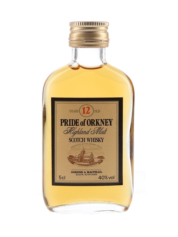 A miniature bottle of Pride of Orkney 12 Year Old Highland Malt Scotch Whisky, produced at an undisclosed distillery and bottled by Gordon & MacPhail. We estimate this was bottled in the 1980s.