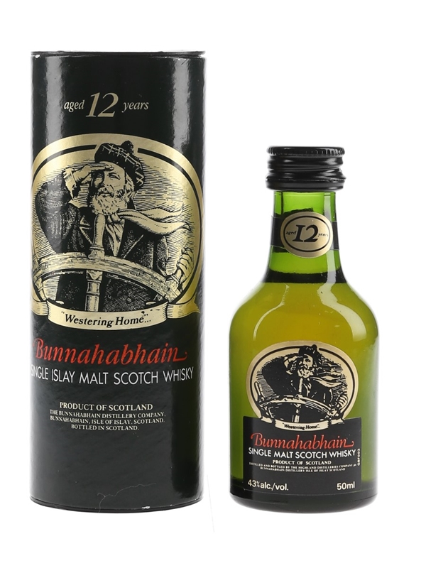 A miniature bottle of Bunnahabhain 12 Year Old Single Malt Scotch Whisky. We estimate this was bottled in the 1980s to 1990s.