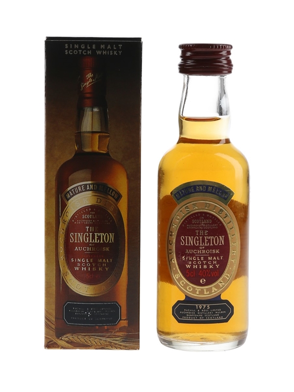 A miniature bottle of The Singleton of Auchroisk 1975 Single Malt Scotch Whisky. This was distilled in 1975 and matured in sherry casks before bottling at 40% ABV.