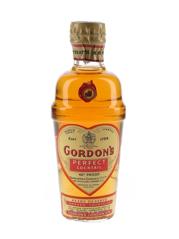 A miniature bottle of Gordon's Perfect Cocktail, sealed with a spring cap closure. This was produced by Tanqueray, Gordon & Co. Ltd. We estimate this was bottled in the 1950s.
