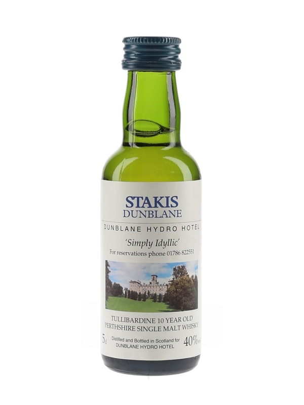 A bottle of Tullibardine 10 Year Old Perthshire Single Malt Whisky, distilled and bottled in Scotland for Stakis Dunblane Hydro Hotel.