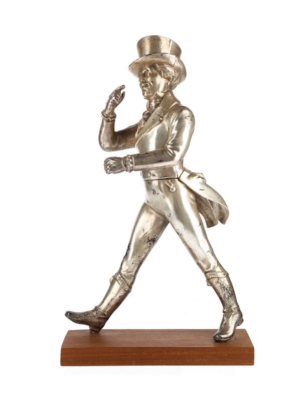 The Johnnie Walker Striding Man, silver coloured on a wooden base.