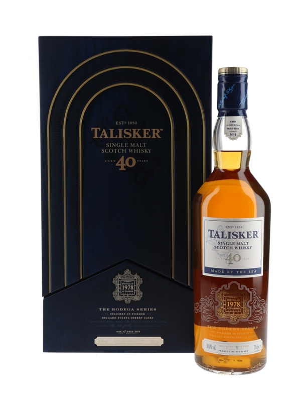 A bottle of Talisker 40 Year Old Single Malt Scotch Whisky, the first release in The Bodega Series which showcases the distillery's connection with sherry casks and producers since its founding in 1830. This was distilled in 1978 and finished in five Quo Vadis Amontillado sherry casks from Delgado Zuleta, a wine producer which first supplied casks to Talisker distillery in 1900.