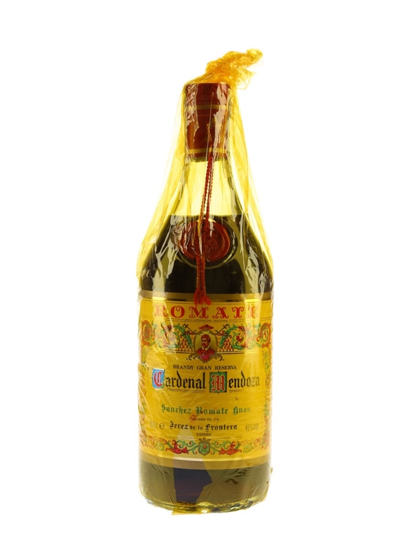 A bottle of Cardenal Mendoza Brandy Gran Reserva, produced by Sanchez Romate in the Spanish sherry-producing region of Jerez, aged in a solera system. We estimate this was bottled in the 1970s.