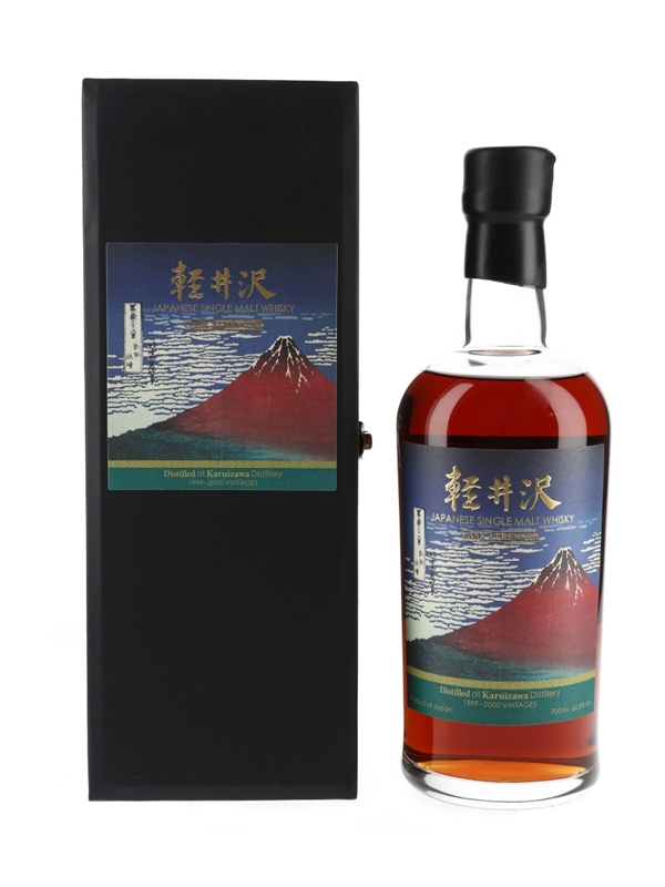 A bottle of Karuizawa from the 36 Views of Mount Fuji series. Each bottle in this series was produced from Karuizawa's final two vintages, 1999 and 2000, and are bottled at cask strength.