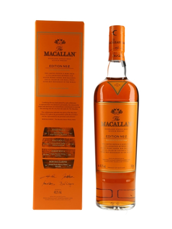 A bottle of The Macallan Edition No.2 Highland Single Malt Scotch Whisky. This is a limited edition matured in four distinct cask types selected by master blender Bob Delgarno and Spanish chefs Joan, Josep and Jordi Roca from El Celler de Can Roca. The restaurant was twice voted best restaurant in the world.