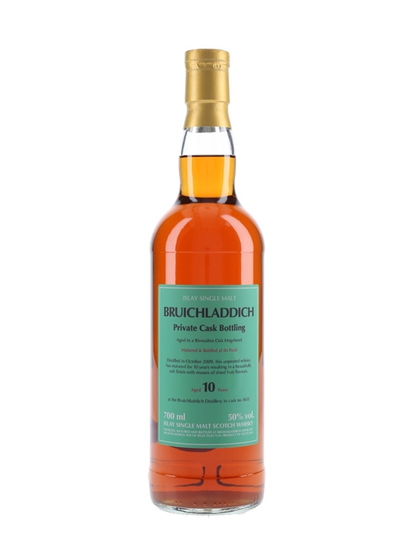 A private cask bottling of Bruichladdich 10 Year Old Islay Single Malt Scotch Whisky. This unpeated whisky was distilled in October 2009, matured in a single Rivesaltes hogshead and bottled at 50% ABV.