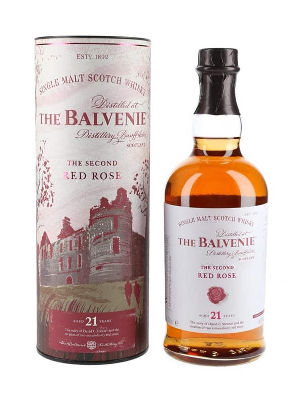 A bottle of The Balvenie 21 Year Old Single Malt Scotch Whisky, The Second Red Rose, matured in Australian shiraz casks and bottled at 48.1% ABV. This is story number 5 in The Balvenie Stories series.