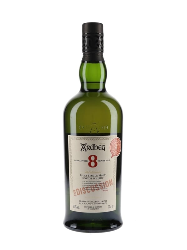A bottle of Ardbeg 8 Year Old Islay Single Malt Scotch Whisky. This is an intense, smoky whisky with notes of charcoal and creosote and described by Ardbeg to be 'deliberately challenging'.