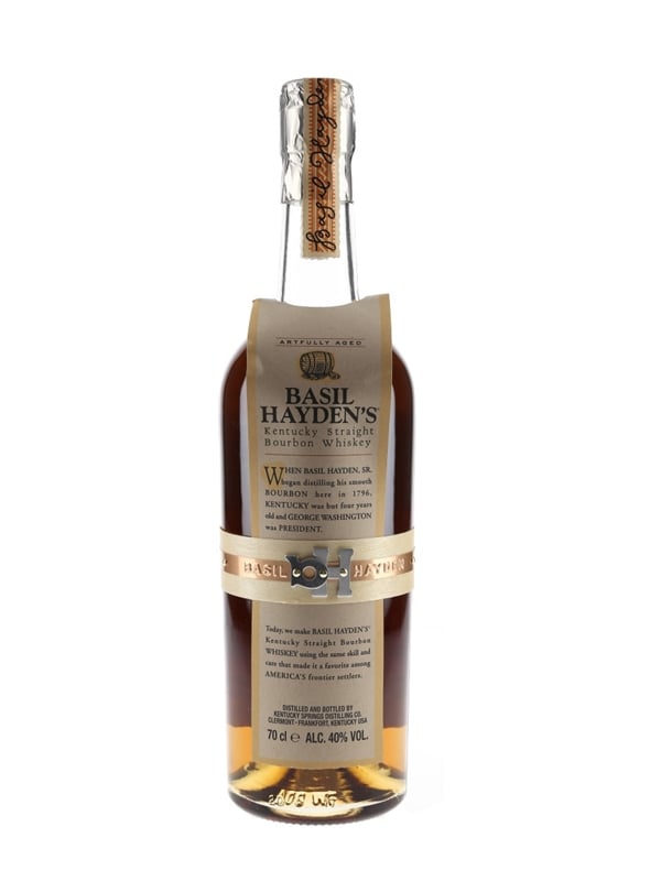 A bottle of Basil Hayden's Kentucky Straight Bourbon Whiskey, distilled and bottled by Kentucky Springs Distilling Co.