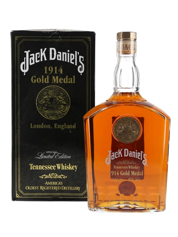 A litre bottle of Jack Daniel's Tennessee Whiskey released to celebrate the gold medal won in 1914 at the Anglo-American exhibition in London. This was bottled in 2000 and is the fourth in the Gold Medal series.