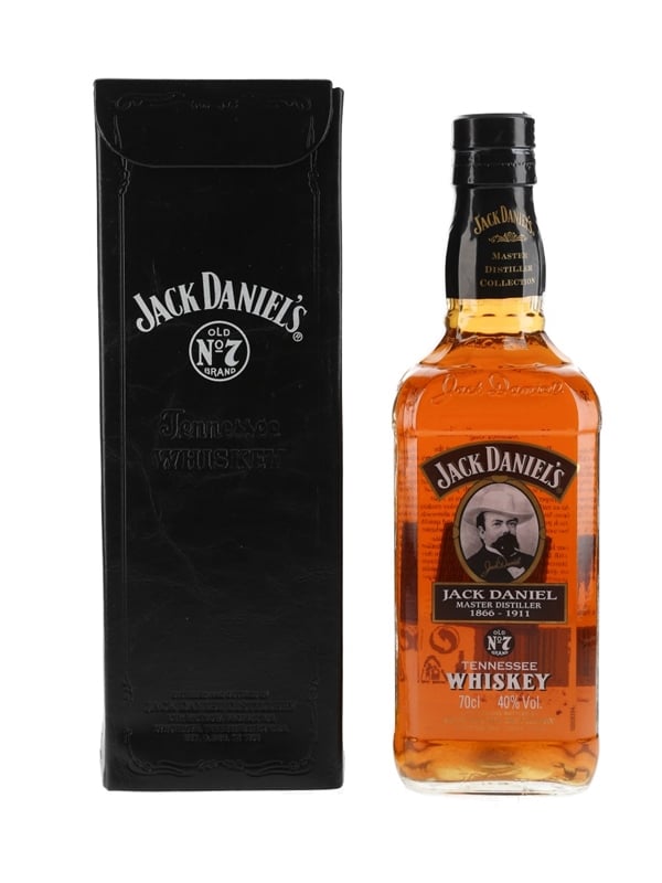 A bottle of Jack Daniel's from the Master Distiller Series, presented in a leather box. This series honours the seven Master Distillers who have overseen the production of Jack Daniel's whiskey since 1875.