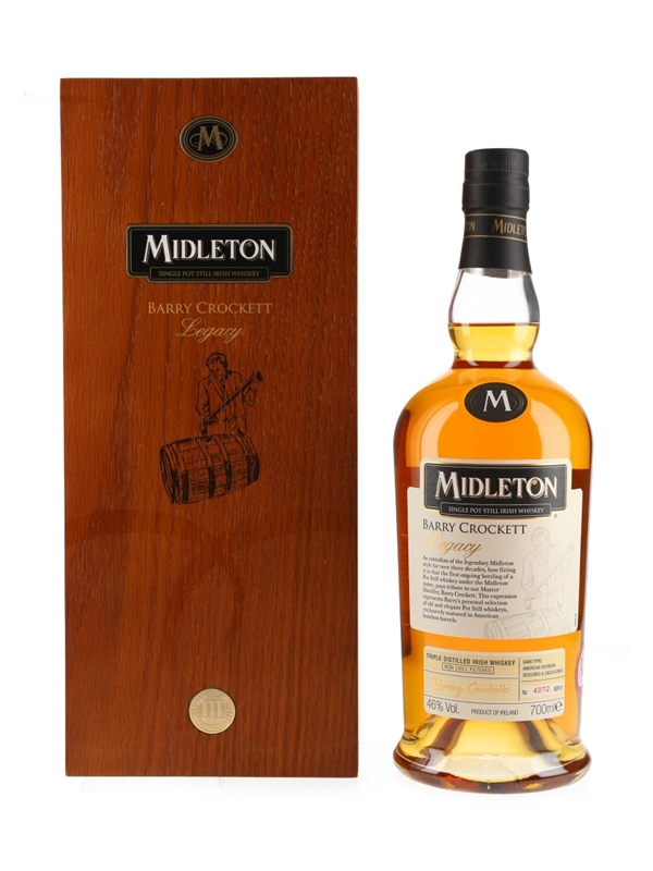 A bottle of Midleton Legacy single pot-still Irish whiskey. This was introduced by Irish Distillers in 2011 as part of the relaunched range of pot-still whiskies. The Barry Crockett Legacy is named for Midleton's master distiller, and combines bourbon cask, and new oak matured whisky.