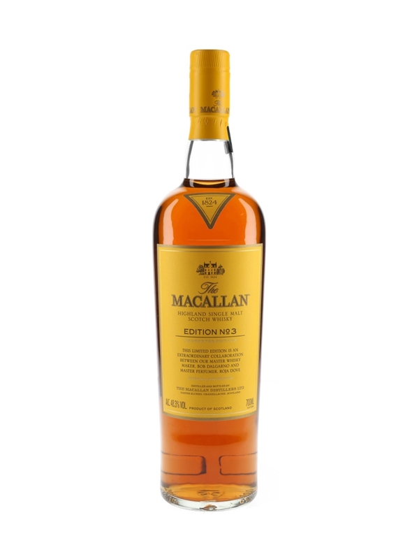 A bottle of Macallan Edition No.3, a limited edition single malt matured in six distinct cask types. This whisky was created in conjunction with Master Perfumer Roja Dove.