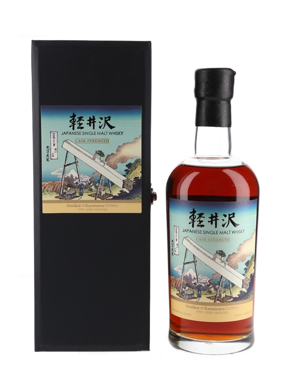 A bottle of Karuizawa from the 36 Views of Mount Fuji series. Each bottle in this series was produced from Karuizawa's final two vintages, 1999 and 2000, and are bottled at cask strength. The labels feature artwork by Japanese ukiyo-e artist Hokusai, depicting Mount Fuji from different aspects.