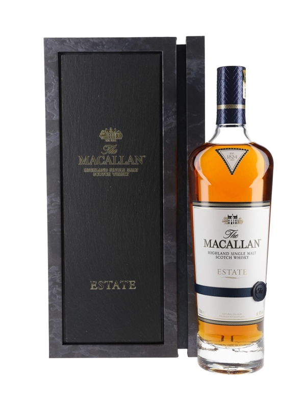 A bottle of The Macallan Estate Highland Single Malt Scotch Whisky, released in 2019. This expression contains a portion of spirit made from barley grown on the Macallan estate, situated on the banks of the river Spey. The estate-grown barley is distilled for just one week per year.