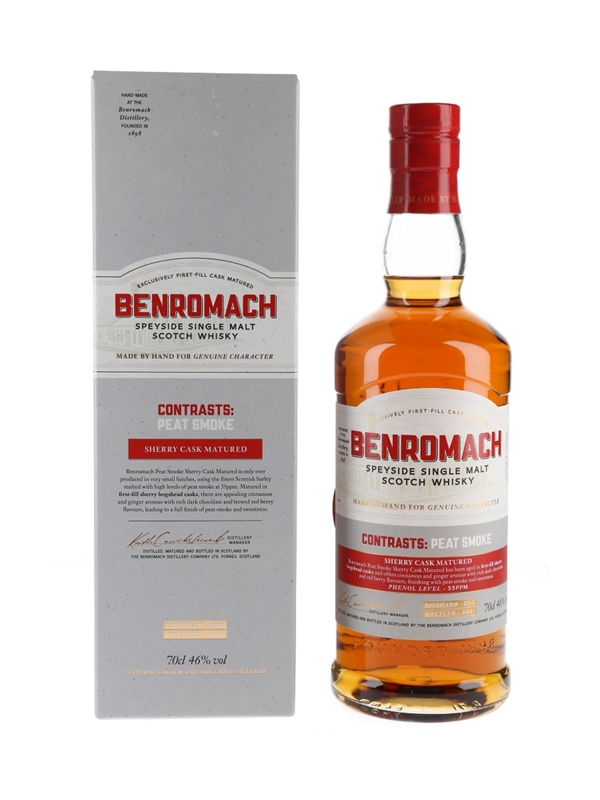 A bottle of Benromach Contrasts: Peat Smoke Single Malt Scotch Whisky. This was distilled from heavily peated barley in 2012, matured in first fill sherry hogsheads and bottled in 2021.