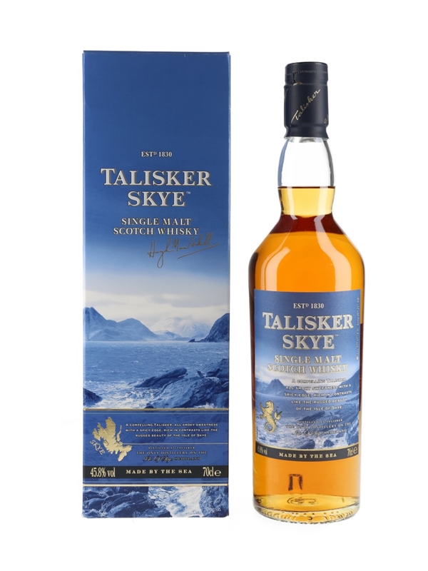A bottle of Talisker Skye Single Malt Scotch Whisky.