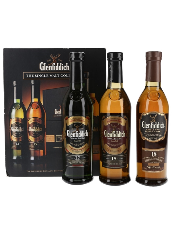 The Glenfiddich collection contains three bottles of single malt Scotch whisky including Glenfiddich 12 Year Old, Glenfiddich 15 Year Old Solera and Glenfiddich 18 Year Old Small Batch.