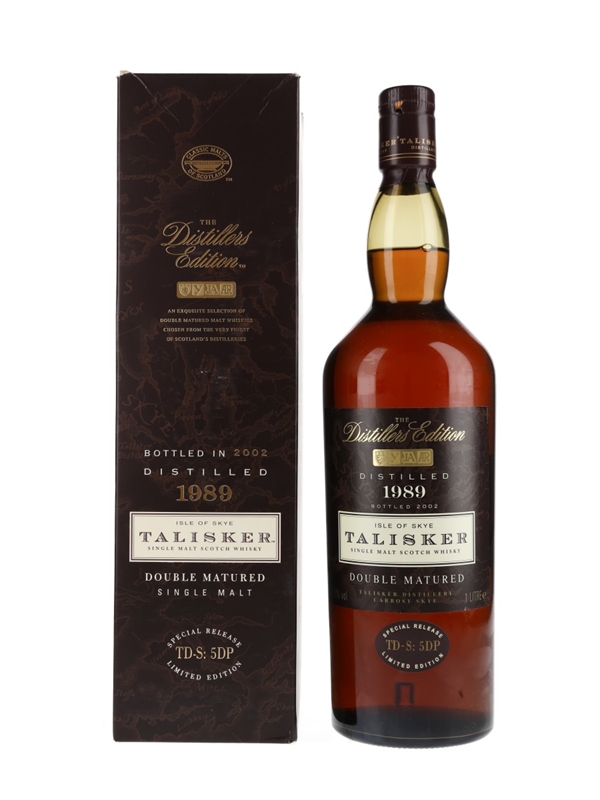 A litre bottle of Talisker 1989 Isle of Skye Single Malt Scotch Whisky. This was distilled in 1989, matured in Jerez amoroso cask-wood and bottled for the Distillers Edition series in 2002.