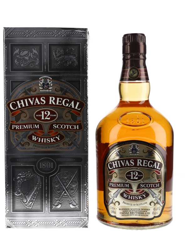 A litre bottle of Chivas Regal 12 Year Old Blended Scotch Whisky. The bottling code indicates this was bottled in 2008.