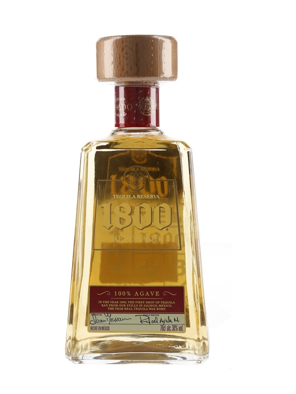 A bottle of 1800 Reposado Tequila, produced with 100% Agave in Mexico.