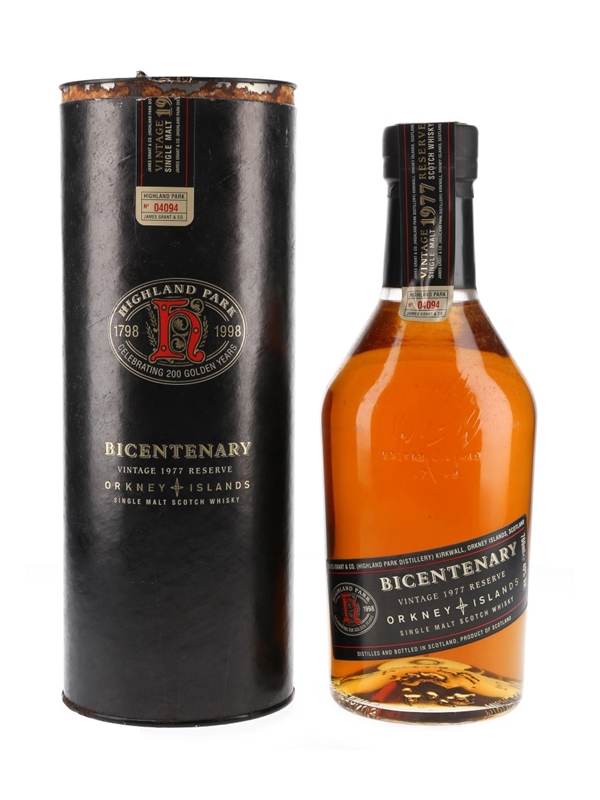 A bottle of Highland Park Vintage 1977 Reserve. This was distilled in 1977, matured for 21 years, and bottled in 1998 to celebrate the distillery's 200th anniversary.