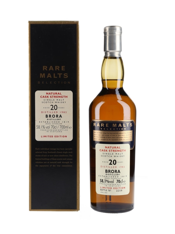 A bottle of Brora 20 Year Old Single Malt Scotch Whisky. This was distilled in 1982 and bottled in April 2003 for Diageo's now discontinued Rare Malts Selection range.