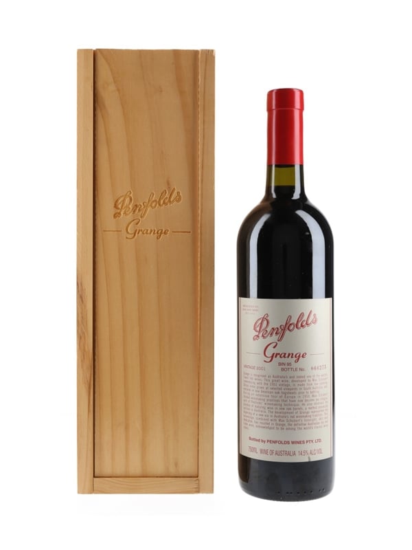 A bottle of Penfolds 2001 Grange Bin 95, from one of the hottest growing seasons in South Australia since the 1920s. This is a blend of 99% Shiraz and 1% Cabernet Sauvignon, 50% of which was harvested from the famed Kalimna vineyard.