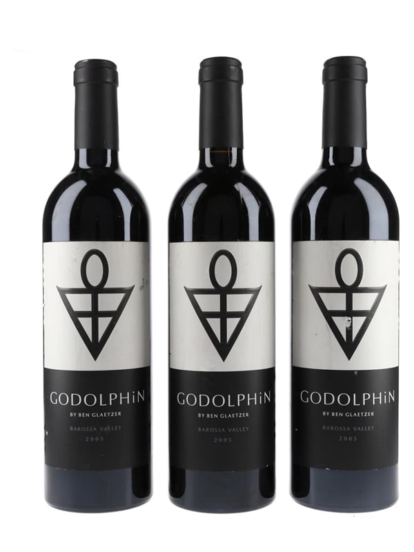 This lot contains three bottles of Godolphin Shiraz-Cabernet 2005, produced and bottled by Glaetzer Wines in the Barossa Valley, South Australia.