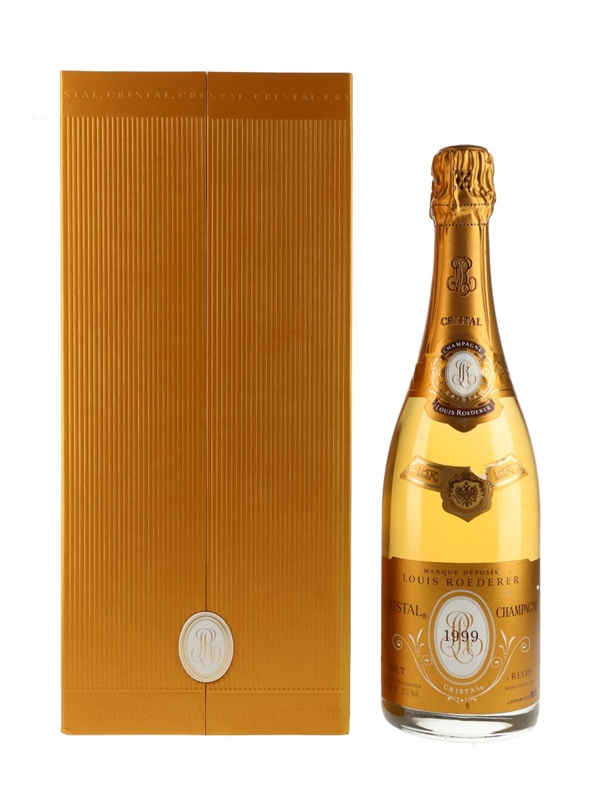 A bottle of Louis Roederer Cristal 1999 Vintage Champagne, presented in a limited edition box. This is a blend of 57% Pinot Noir and 43% Chardonnay.