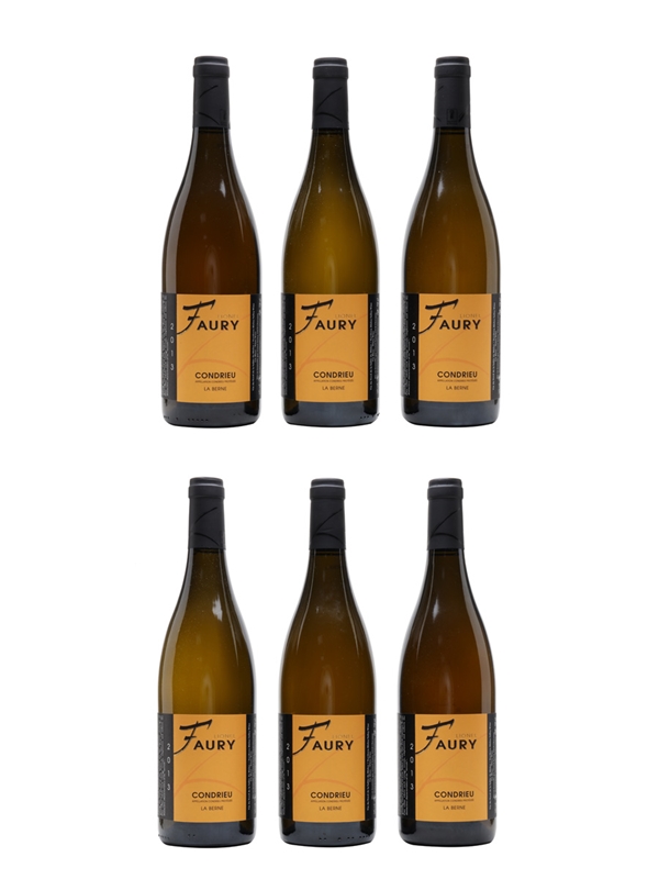 This lot contains six bottles of Condrieu La Berne 2013 from producer Lionel Faury, harvested from a 3.3 hectare holding of Condrieu planted on granite slopes with a gradient of up to 55%. The wine is aged for 11 months on lees in 10% new barrels, 30% 2 to 5 year-old barrels, and 60% stainless steel and - tasted in our offices prior to listing - has the perfume and texture typical of top-flight examples of Northern Rhône Viognier, balanced by an elegant, fresh, linear finish.