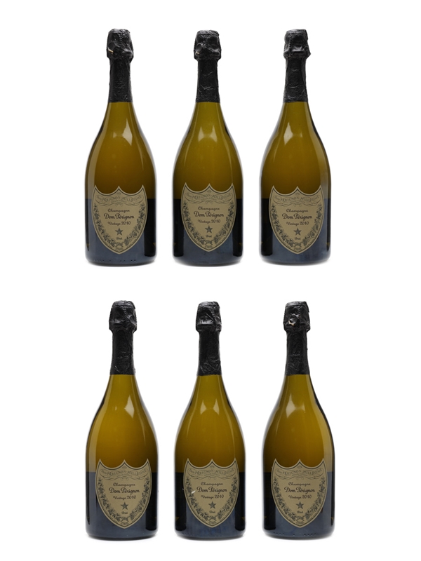 This lot contains six bottles of 2010 Dom Pérignon vintage Champagne, a blend of 54% Chardonnay and 46% Pinot Noir.