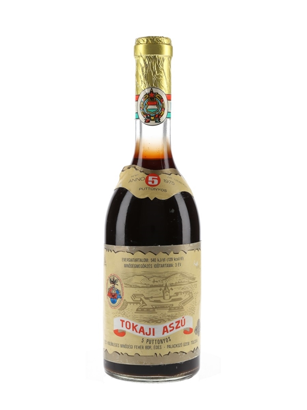 A 50cl bottle of 1975 Tokaji Aszú 5 Puttonyos sweet wine bottled by Tolcsva, Hungary.