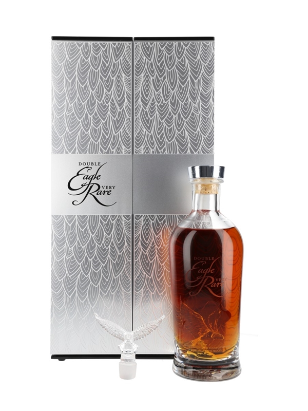 A limited edition bottle of Eagle Rare Double Eagle Very Rare 20 Year Old Kentucky Straight Bourbon Whiskey, bottled by Buffalo Trace Distillery. This is presented in a crystal bottle with a eagle shaped stopper in a light up wooden presentation box.