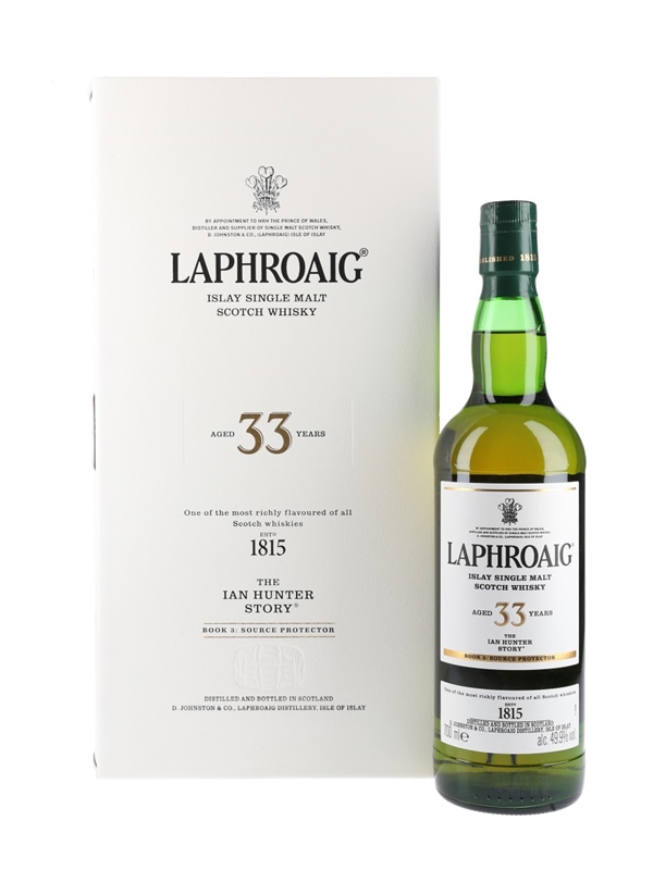 A bottle of Laphroaig 33 Year Old Islay Single Malt Scotch Whisky, the 2021 release in the Ian Hunter series which celebrates the legacy of the last of the Johnston family to own and manage the Laphroaig Distillery. This is Book 3: The Source Protector, and was fully matured in refill ex-Bourbon barrels and bottled at 49.9% ABV.