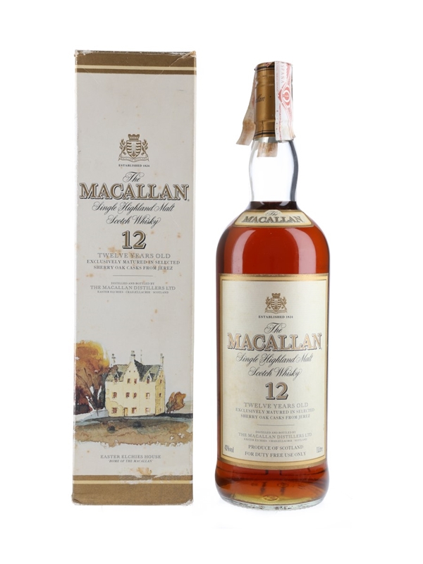 A litre bottle of The Macallan 12 Year Old Single Highland Malt Scotch Whisky, matured in sherry wood. This was bottled for duty free stores, we estimate in the early 2000s.